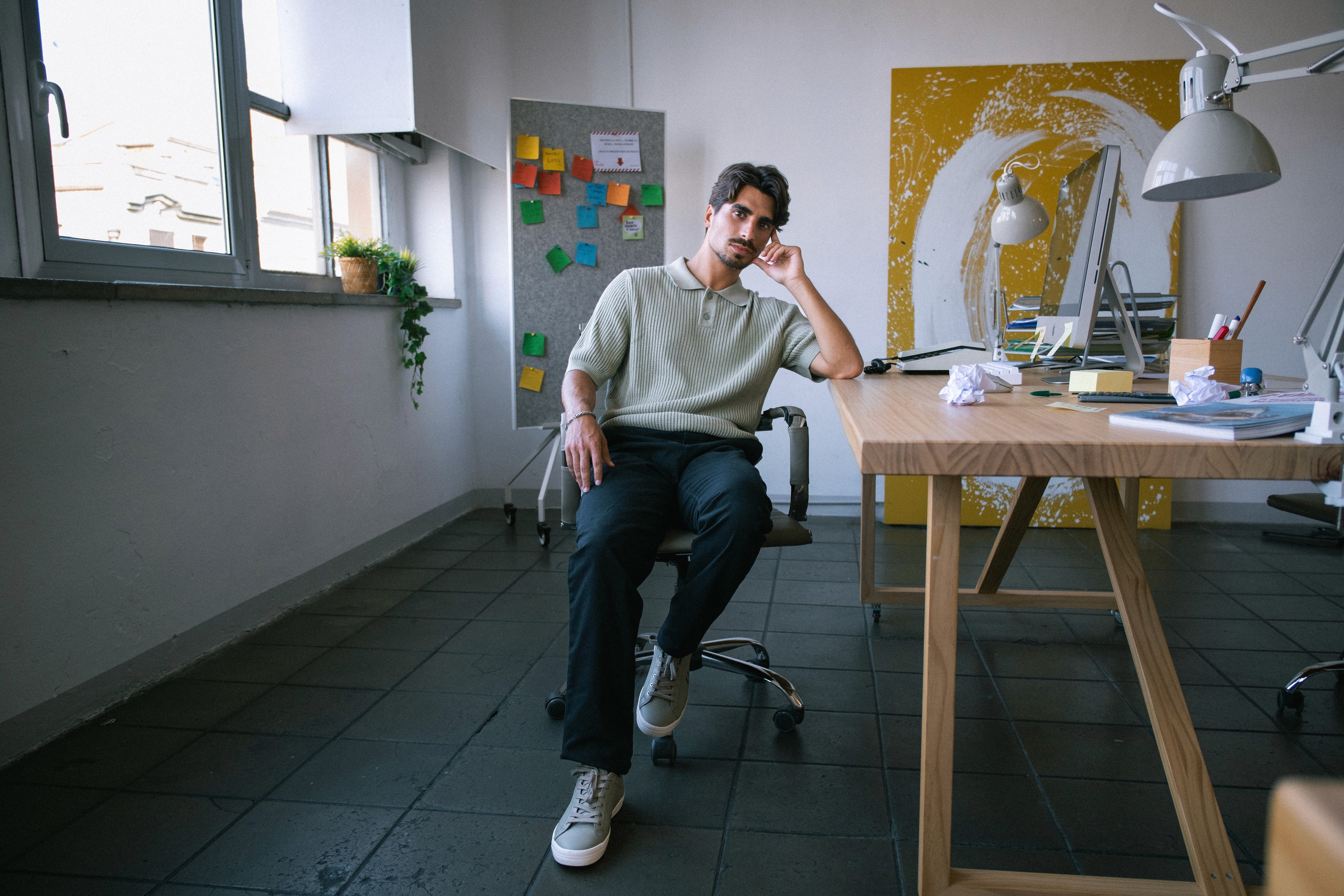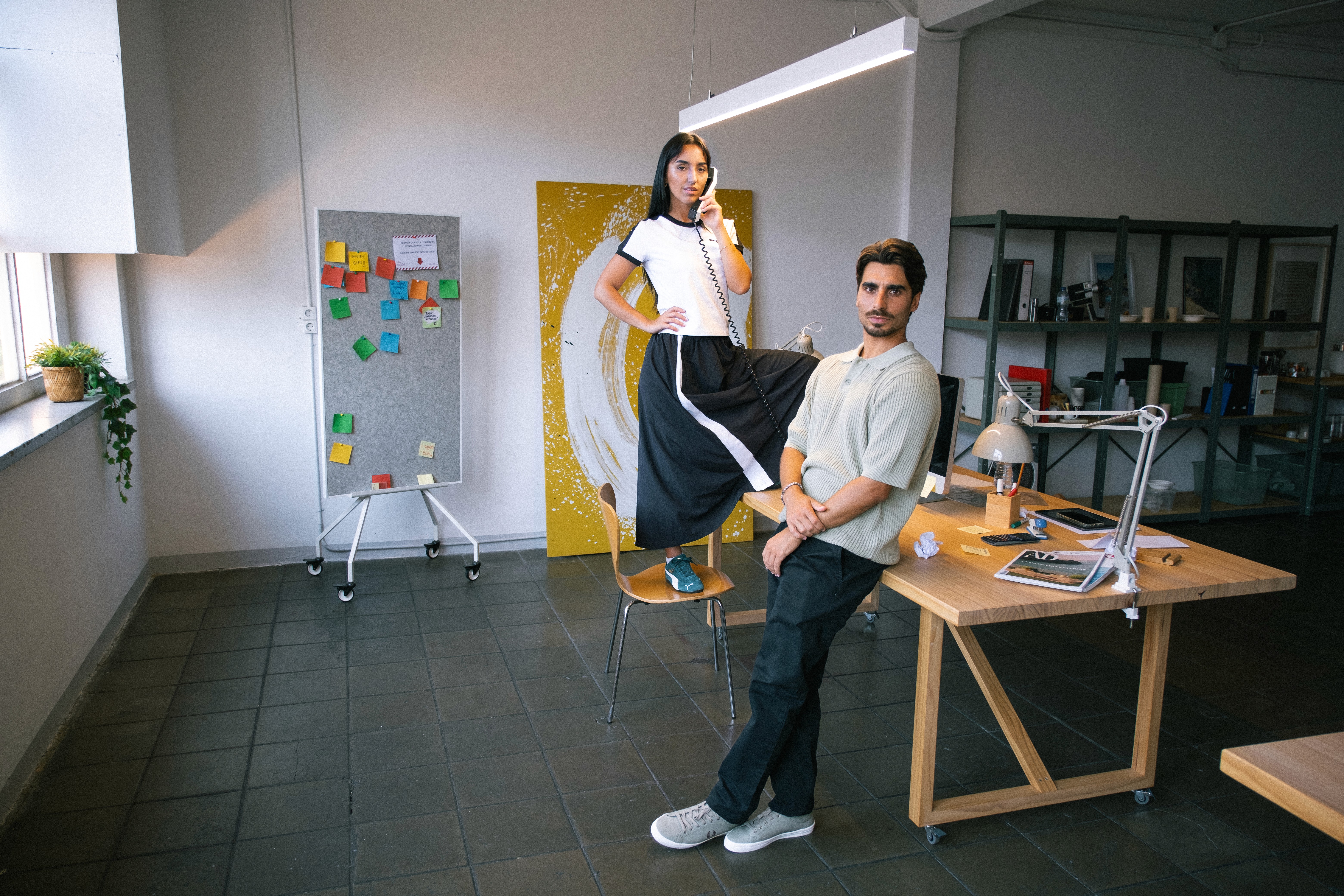 El proyecto se articula en dos tiempos. Primero, el espacio de trabajo se convierte en escenario creativo: escritorios, sillas y papeles forman parte de la composición visual y del juego de poses. Después, la narrativa se desplaza al exterior, donde la jornada continúa en clave urbana, con una actitud más espontánea y natural.